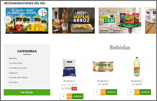 La opción de catálogo del Sistema muestra la lista de productos de una determinada categoría, el software presenta cada producto con la opción de selección la cantidad con los botones con signo más (+) y menos (-), una vez se hace clic en el botó AGREGAR este pasará al carrito de compras para luego realizar el pedido o comprar directa a través de la pasarela de pagos que presente el Sistema.