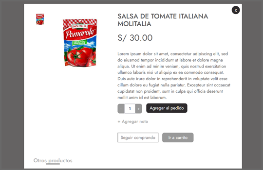 El Catálogo del Sistema permite tener en una ventana flotante el detalle de cada producto, donde podrá presentar más de una foto del producto, presentar una descripción, el precio, los artículos adicionales y una lista de productos relacionados. Adicional a este detalle el Sistema permite limitar el horario de atención, administrar los distritos para el delivery y permitir presentar adicionales como los combos del producto.
