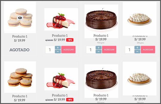 La opción de catálogo del Sistema muestra la lista de productos de una determinada categoría, el software presenta cada producto con la opción de selección la cantidad con los botones con signo más (+) y menos (-), una vez se hace clic en el botó AGREGAR este pasará al carrito de compras para luego realizar el pedido o comprar directa a través de la pasarela de pagos que presente el Sistema.