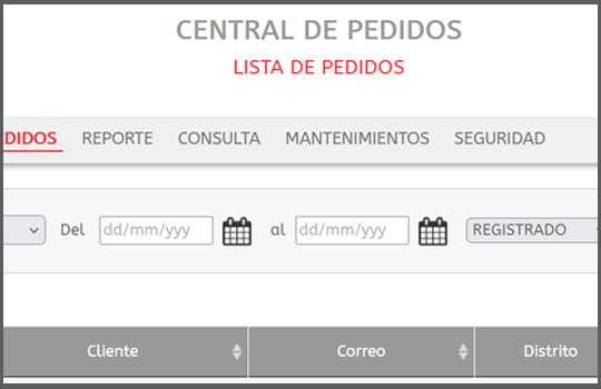 La Central de Pedidos es un ambiente donde se podrá revisar los pedidos recibidos por los diferentes canales de ventas, pedidos realizados por el Sitio Web, por un móvil, por el registro de una llamada de teléfono o WhatsApp entre otros. Además se puede revisar el pedido y modificar direcciones de despacho, el estado del pedido para llevarlo a despacho o anularlo; los pedidos aprobados pasarán al Punto de Venta para la emisión del comprobante de pago e impresión del ticket con la relación de productos al delivery. En este ambiente se encuentras las opciones para limitar el horario de atención, gestionar los delivery y el mantenimientos de Clientes, productos, categorías entre otros.