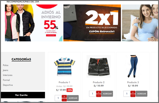 La opción de catálogo del Sistema muestra la lista de productos de una determinada categoría, el software presenta cada producto con la opción de selección la cantidad con los botones con signo más (+) y menos (-), una vez se hace clic en el botó AGREGAR este pasará al carrito de compras para luego realizar el pedido o comprar directa a través de la pasarela de pagos que presente el Sistema.