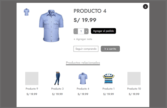 El Catálogo del Sistema permite tener en una ventana flotante el detalle de cada producto, donde podrá presentar más de una foto de la ropa, describir la estructuras de la prenda de vestir, el precio, los artículos adicionales y una lista de productos relacionados. Adicional a este detalle el Sistema permite limitar el horario de atención, administrar los distritos para el delivery y permitir presentar adicionales como los combos de prendas de vestir.